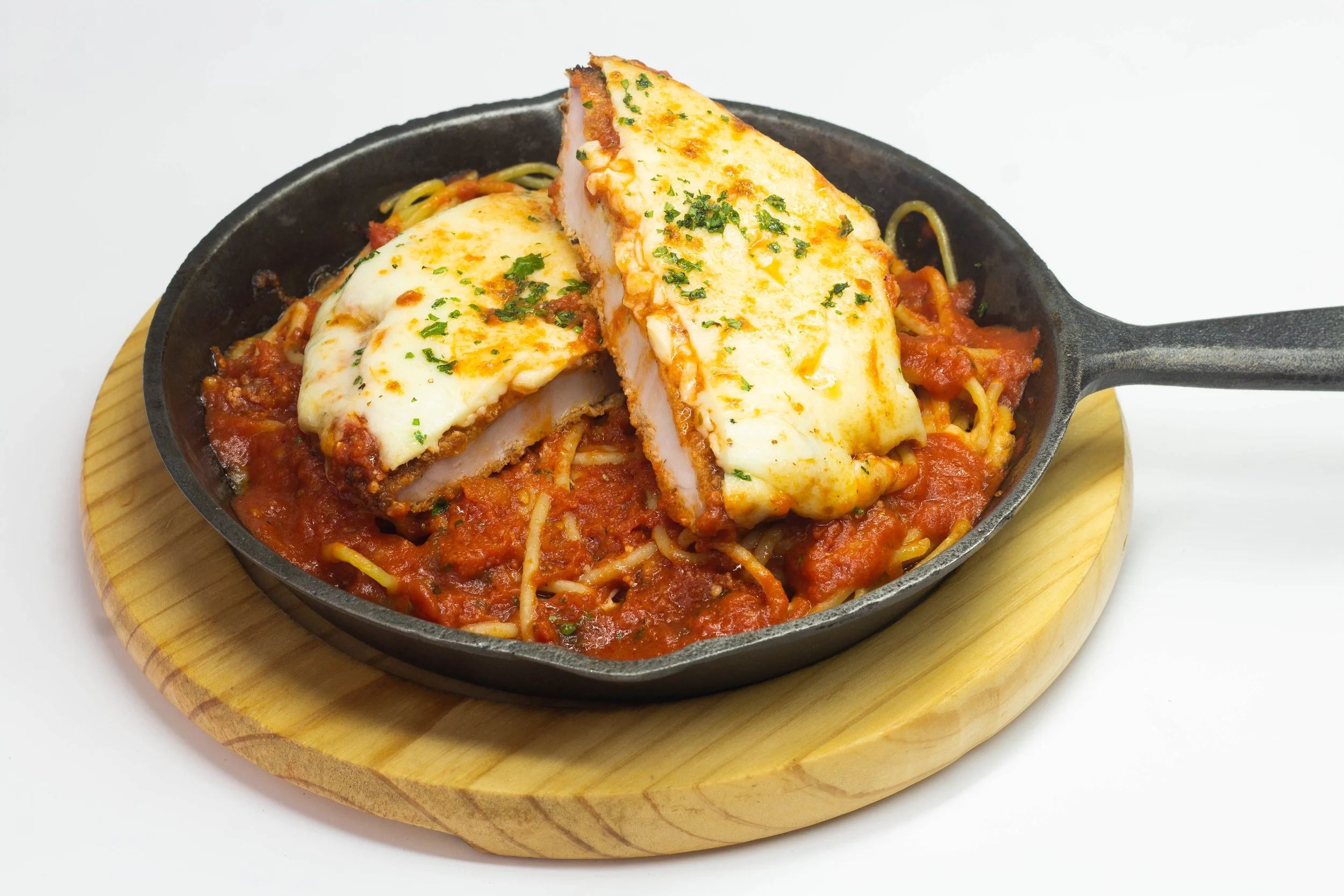 Pan-fried breaded chicken fillet topped and baked with flavorful marinara sauce, freshly grated parmesan, and mozzarella cheese. Served on a bed of spaghetti noodles.