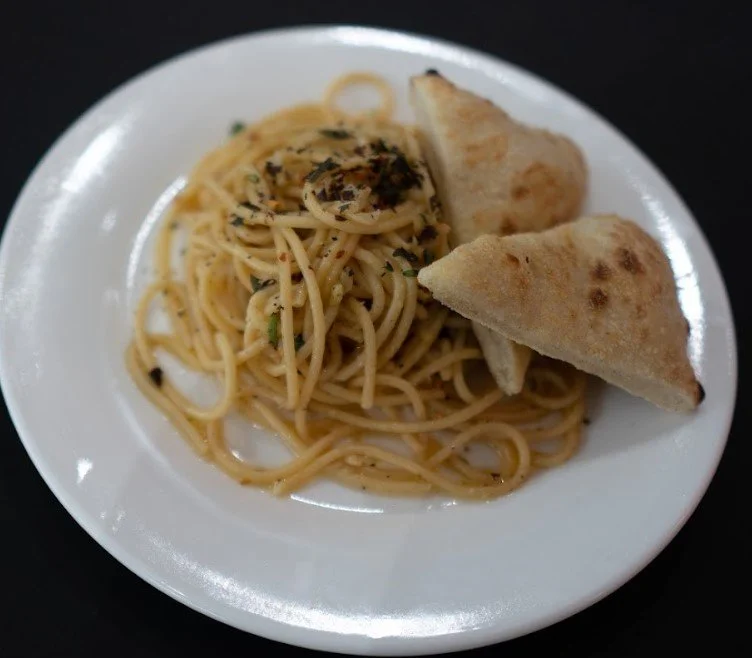 Spaghetti with sautéed garlic in olive oil topped with chili flakes, grated parmesan cheese, and finely chopped italian parsley.