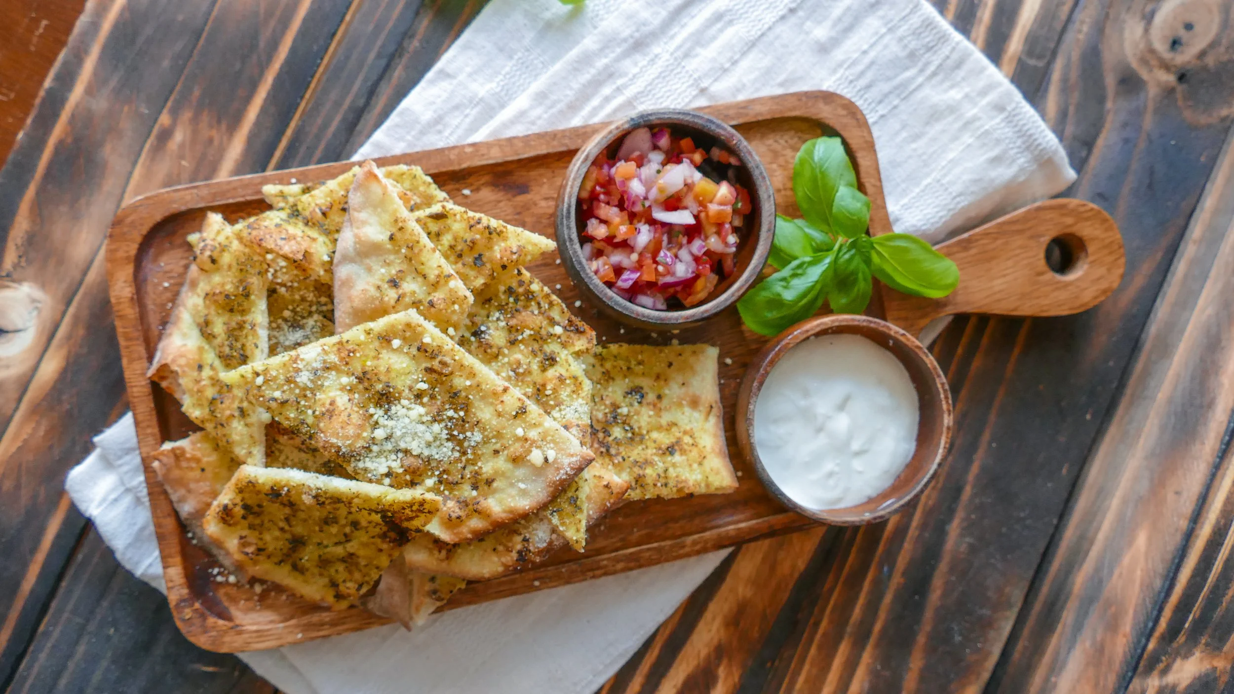 Fresh pane bread with a dash of pesto, served with a side of salsa and sour cream.