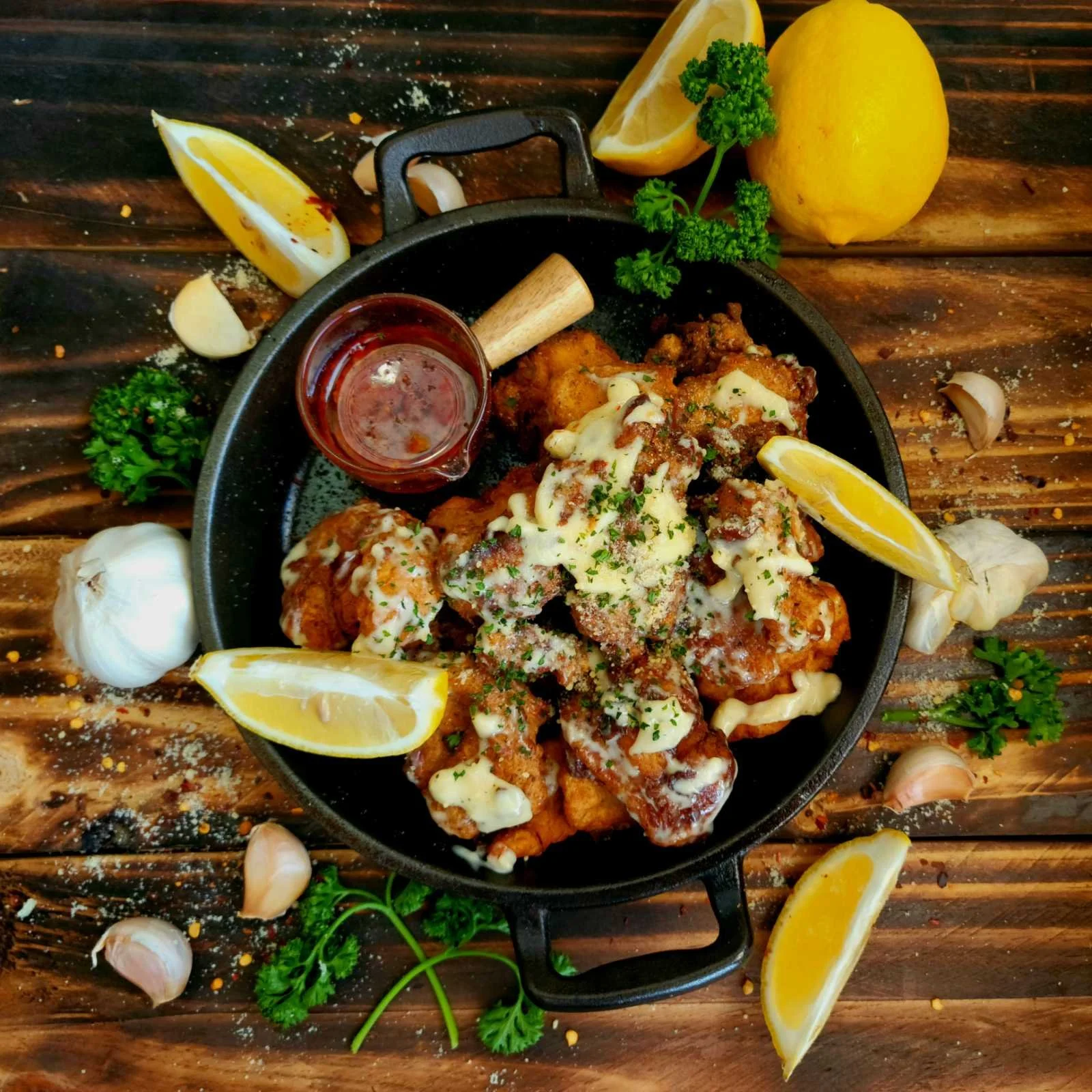 A delightful crispy fried chicken fillet loss in our special biggie sauce, choice of Plain fried chicken, Garlic parmesan , Pesto garlic sauce or Creamy tomato garlic sauce.